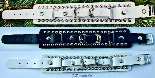 ♥Odos imitacijos apyrankė su sagtele ir kniedėmis. Spalvos: juoda arba balta. Dydis reguliuojamas.