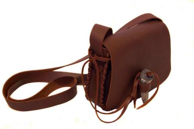Natūrali oda. Rankų darbo. Matmenys 18x14,5x5 cm. Su raginiu kaiščiu.