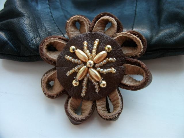 Rankų darbo segė iš naturalios odos siuvineta karoliukais. Seges skersmuo apie 7cm. Spalvos: rudi atspalviai. Užsegimas: žiogelis.