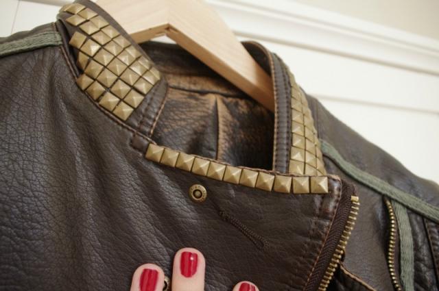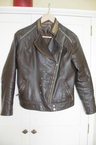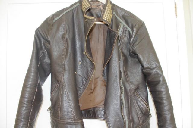 šokoladinės spalvos,auksiniais užtrauktukais,per šoną užsegama ,plačiais atlapais kirpta,auksinėmis kniedėmis dabinta odinė striukė(koža)