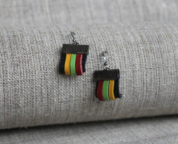 Spalvingi lengvi auskarai Jūsų išvaizdai suteiks žaismingumo ir pagyvins nuotaiką. Tai puikus stiliaus akcentas minint Lietuvos nepriklausomybės šimtmetį. Auskarai pagaminti iš natūralios odos, dekoruoti kniedėmis. Auskarų plotis – ~15 mm, aukštis – ~20 mm Sudėtis: natūrali oda, metalinės detalės Daugiau odinių gaminių www.evaleath.lt