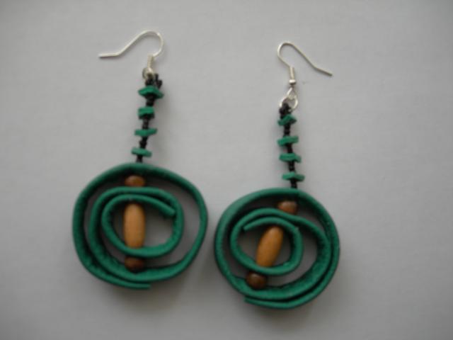Auskarai pagaminti iš natūralios odos, medinių karoliukų. Skersmuo - 4cm, ilgis - 6 cm.