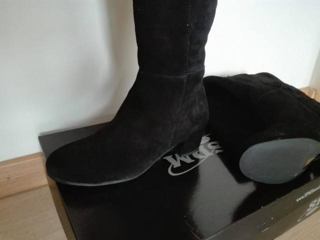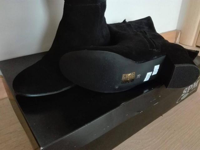 Labai labai gražiai ant kojos atrodantys SPM (Olandija) odiniai sezoniniai batai. Ilgis - virš kelių, su sijonu ar aptemtom kelnėm atrodo įspudingai. Žemas klasikinis kulnas, odiniai, labai patogūs, gražiai priglunda prie kojos. 85 eurai, 38 dydis