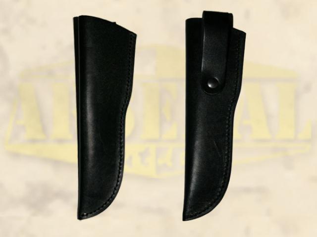 Dėklas pagamintas iš storos, natūralios galvijų odos, tinkantis maždaug 25 centimetrų ilgio peiliams.
