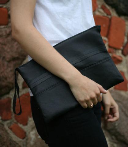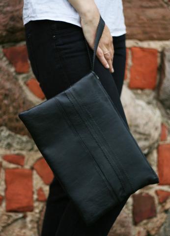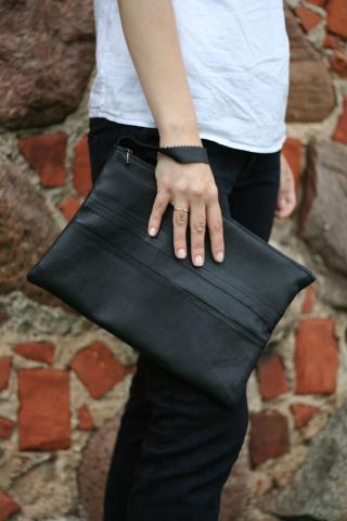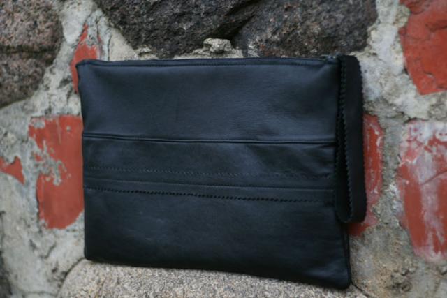 Juodos spalvos delninukas. Iš natūralios odos. Viršuje užsegamas užtrauktuku.Pamušalas mėlynas. Išmatavimai: 32 x 21 cm