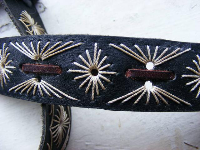 odinė apyrankė ir odinis ale 'antkaklis', abu išsiuvinėti. gražus šiaip dalykas