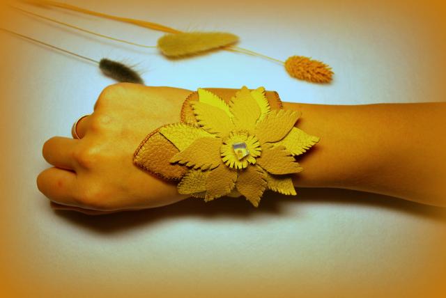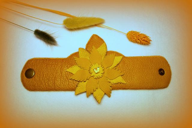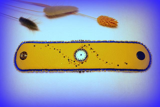 Odinė apyrankė, čekiško stiklo apdaila, pasidabruotos detalės ir filco nugarėlė - šilta ir švelni rankoms.