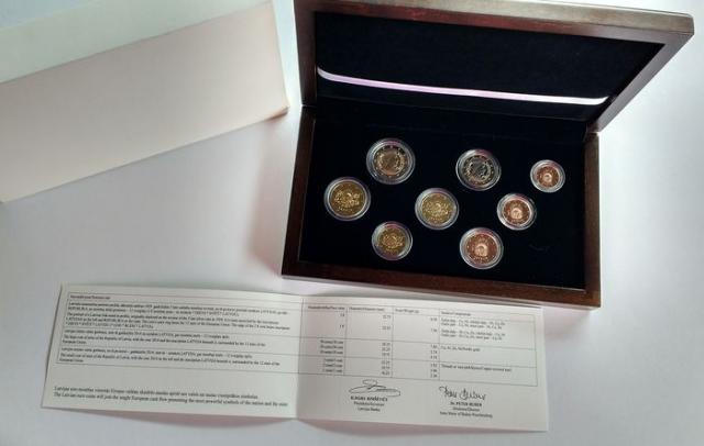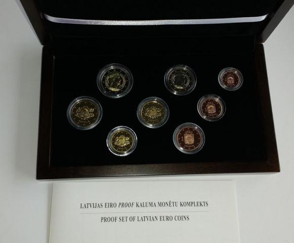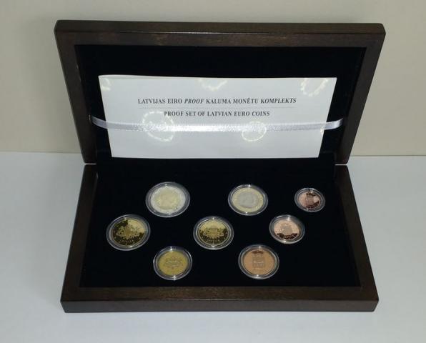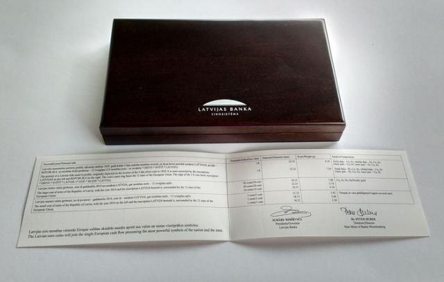 Latvijos 2014 metų eurų monetų (1 ct - 2 eur) rinkinys, proof kokybė su sertifikatu. Gražioje medinėje dėžutėje. Tiražas tik 5000 vnt. Atsiėmimas Vilniuje arba siuntimas registruota pašto siunta (+ 2,5 eur).