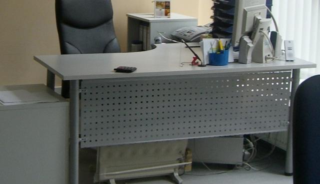 pilki ofiso baldai - 5 darbo stalai su sintelemis, su spintomis, kedem, su apvaliu satlu pokalbiams, su kanceliarinem prekem- vienu zodziu paruostas darbui ofisas