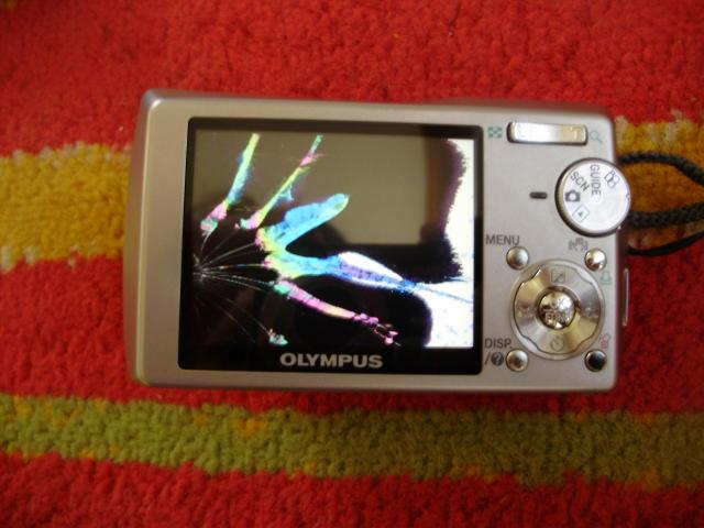 Naudotas pora mėnesių, tačiau kelionėje stipriai buvo suspaustas ir iš vidaus skilo ekranas, bet pataisyti įmanoma ir galima (žr.foto) Fotografuoja ir filmuoja kaip niekur nieko, tačiau nesimato per ekraną ką. Yra dėžutė, instrukcija, dėklas, mikro sd 512mb kortelė, usb laidas ir baterijos pakrovėjas