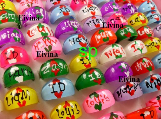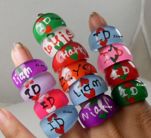 Visiškai nauji One Direction žiedai :) Su vardais - Harry, Zayn, Niall, Louis, Liam, ir su užrašu " 1D ". Kaina 5Lt / vnt. ;) NEMAINAU.