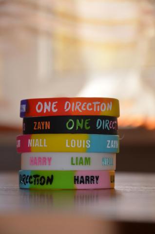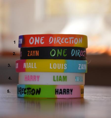 Šiuo metu ypač populiarios grupės atributika - apyrankė. Apyrankės plotis ~ 1cm, ilgis ~ 10cm. Vieno vieneto kaina 5lt. Naujos! Gražių įvairių spalvų. Užrašas ant apyrankės: One Direction + išvardinta visų vaikinų vardai. Kaunas/Plungė. Registruotu paštu siunčiu ir į kitus miestus (+5Lt)