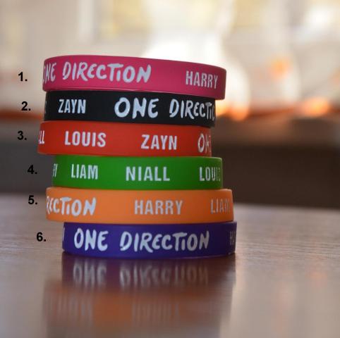 Šiuo metu ypač populiarios grupės atributika - apyrankė. Apyrankės plotis ~ 1cm, ilgis ~ 10cm. Vieno vieneto kaina 5lt. Naujos! Gražių. Užrašas ant apyrankės: One Direction + išvardinta visų vaikinų vardai. Kaunas/Plungė. Registruotu paštu siunčiu ir į kitus miestus (+5Lt)