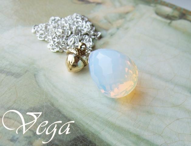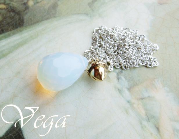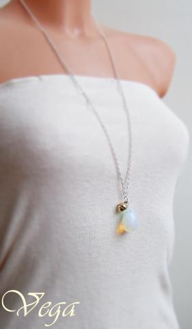 Balto metalo grandinėlė 74 cm, sinetinis opalas 2,5 cm, sendinto aukso spalvos metalo giliukas