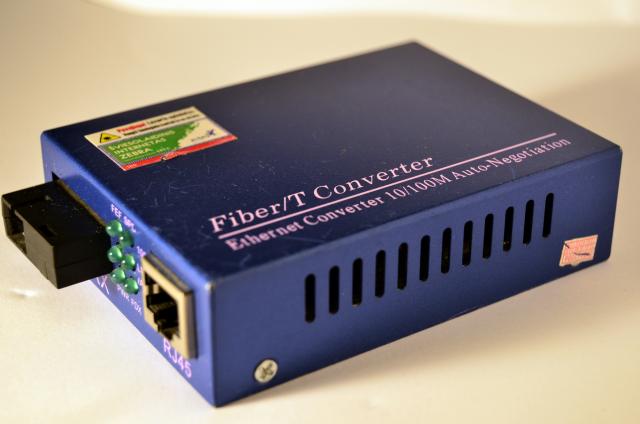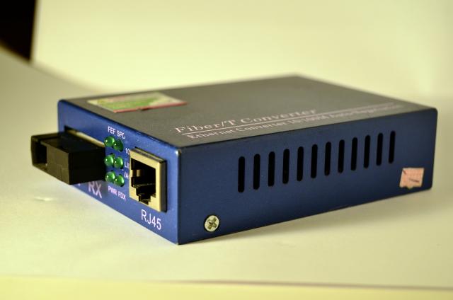 Optinis tinklo keitiklis. Įeina optinis kabelis - išeina UTP tinklo kabelis. Veikiantis, be maitinimo šaltinio. (Tiks bet koks 5V maitinimo blokas.)
