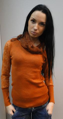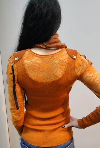 Oranziniai megztukai su neriniuotom rankovytem, salis su grandinelem. Nugara su gifiuru.