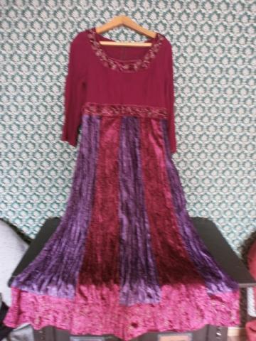 purpurinės, violetinės aksomo spalvų suknelė, ilgio iki kauliukų. Tiktų ir S ir M dydžius nešiojančioms.