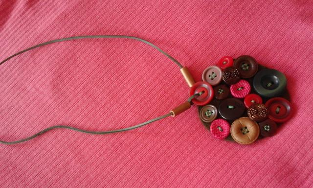 Vienetinis kaklo papuošalas iš sagų. Vidinėje pusėje-juodos spalvos odos imitacija. Žalvario spalvos metalinis užsegimas. Netikros odos juostelė.