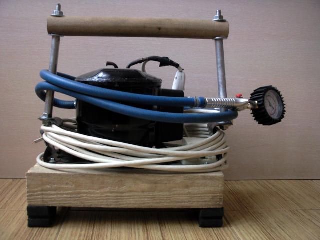 Oro kompresorius savos gamybos su 1 m. gumine zarna, 5 m. ilgio laidu ir manometru . Slegis iki 16 bar. Tinka automobilio, dviracio padangoms pripusti. Dirba labai tyliai, ekonomiskas.