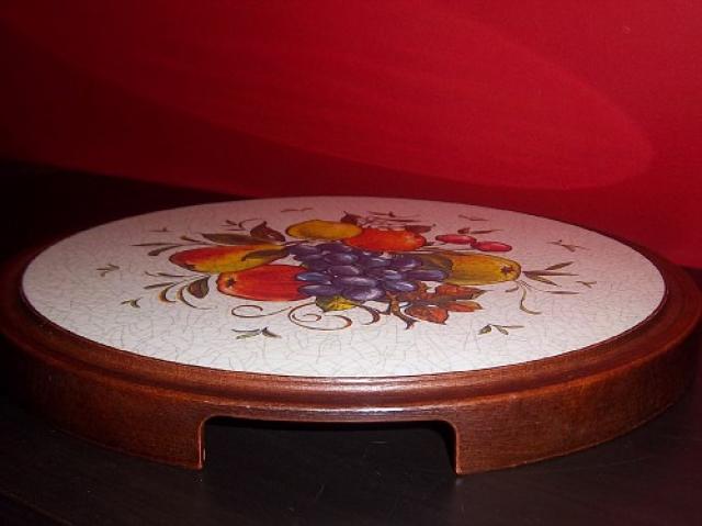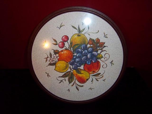Padėklas su vaisiais, pagrindas medinis, būklė puiki, 33cm skersmens,