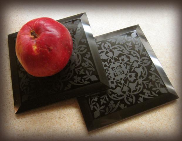 Nauji stikliniai barokinio stiliaus padėkliukai. Apačioj - mažos guminės kojelės. Obuolys nepridedamas:)
