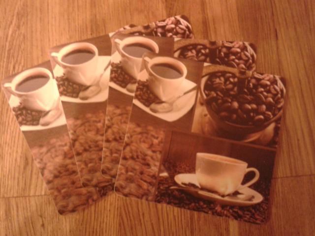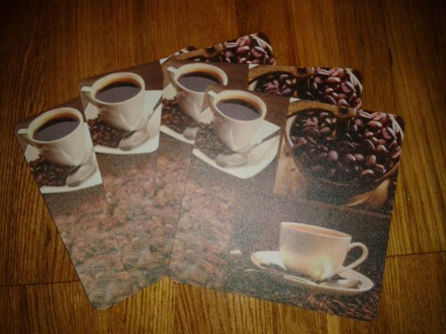 Padėkliukai puodeliams. Spalva tokia kokia pirmoj nuotraukoj, nenublukę, matyti antroje foto. Blizga dėl blyco