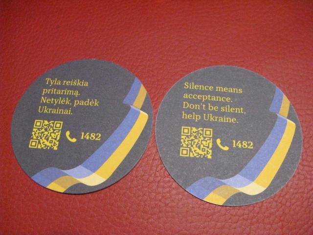 Naujas, plonas kartonas, užrašas: Tyla reiškia pritarimą. Netylėk, padėk Ukrainai.