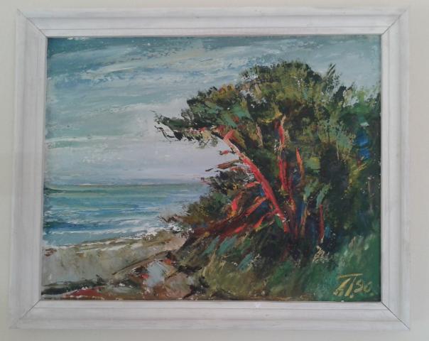 Aliejus ant kartono, įrėmintas. Paveikslas pirktas Klaipėdoje ~1984 m iš autoriaus, autoriaus parašas yra, bet vardas nežinomas. Paveikslo matmenys 46*57 cm.