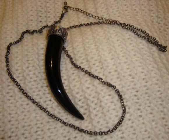 Ilgoka grandinėlė, žemiau krutinės, pati iltis apie 10 cm ilgio, gana vertinga