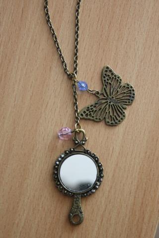 Dailus žalvario spalvos pakabutis, kabo ant ilgos grandinėlės :) Veidrodukas gan nemažas, iš dviejų pusių. Pakabukas buvo porą kartų nešiotas, bet nėra nusitrynęs.