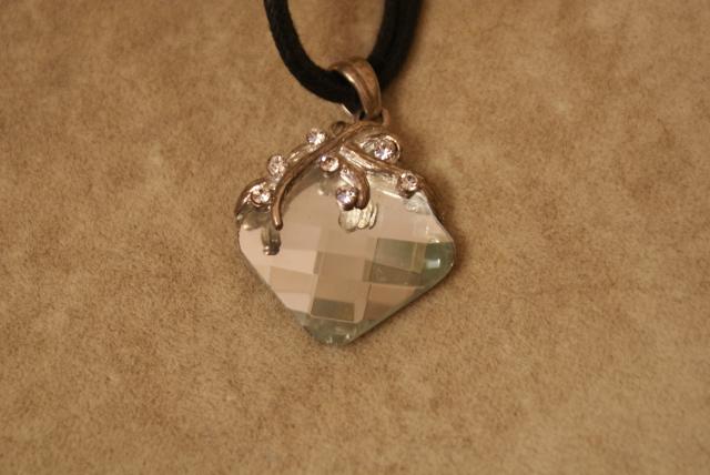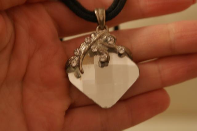 Pakabukas ant kaklo su juoda virvele. Pakabukas veidrodinis, papuošimas su krištoliukais. Apatinis kraščiukas nelygus, bet tai pastebima tik iš arti. Pirmoje nuotraukoje bandžiau tai nufotografuoti. Užsidėjus labai gražiai ir prabangiai atrodo.