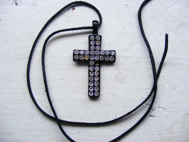 pakabukas-kryžius su blizgančiais deimančiukais (vienas pasimetęs). ant odinės virvutės