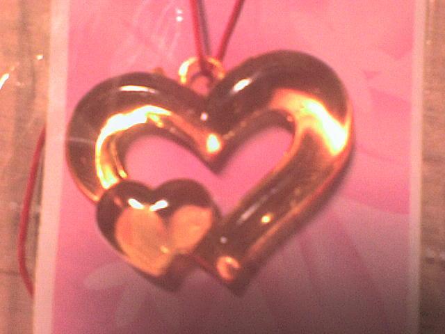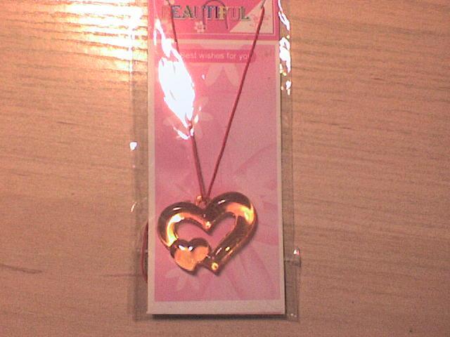 Raudona ilga virvelė, pakabutis iš permatomos, geltonos , nelanksčios plastmasės. Pakabutis dar net neišpakuotas, nors gan senokas.