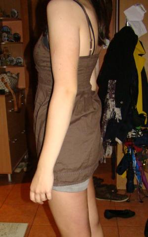 Ruda palaidinė su petnešėlėmis. Gana ilga, į apačią platėjanti. Ant krūtinės medžiaga išsiūvinėta gėlytėmis. Nugaroje suraukta.