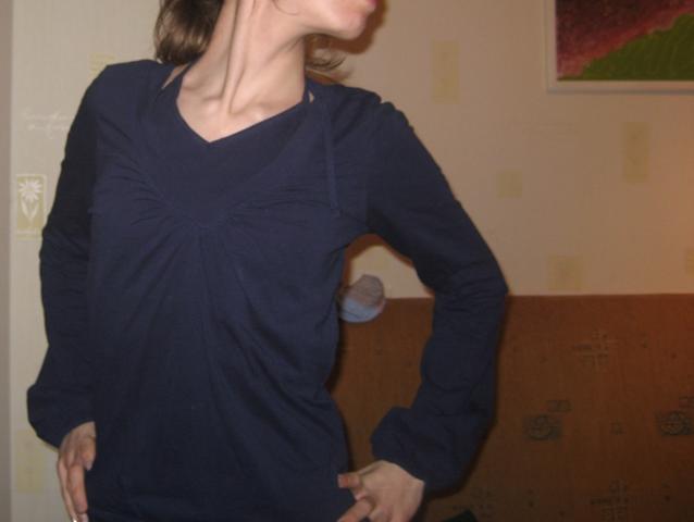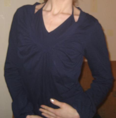 iš vidaus prisiūta (jau nuo šiek tiek aukščiau) papildoma dalis, kuri sudaro vaizdą, tarsi po apačia vilkima maikutė, kuri susiriša per kaklą. p.s. galima sakyt naujas daiktas, vilkėjau kokį kartą tik, neprikibo spalva man ;]