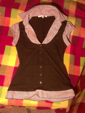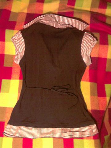 Marskinukai su liemene, Juodos spalvos liemene ir juostelemis marskineliai, marskineliu spalva rausva su tamsesnes spalvos juostelemis. Nugaroje susirisa.