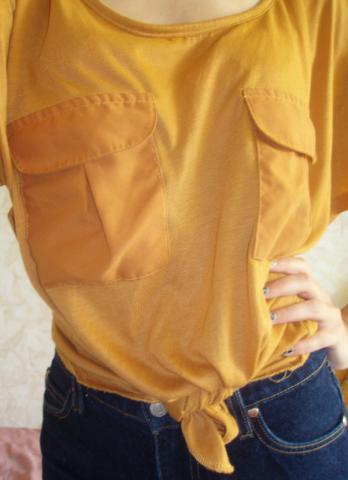 Įdomi palaidinė, garstyčių spalvos. Yra du kišenukai priekyje, ir susiriša mazgelis apačioje. Laisvai krentanti. S/M d.