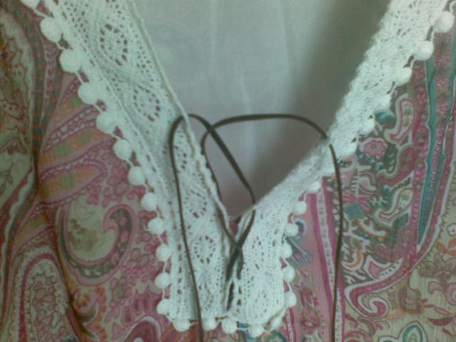 Nusipirkau, bet nebuvo progos apsivilkti. Platėjančios rankovės, priekyje susiriša indėniško tipo raišteliu, apykaklė nėriniuota. Iš šifono ir su pamušaliuku, apačioj kutukai. Labai maloni ir lengvutė
