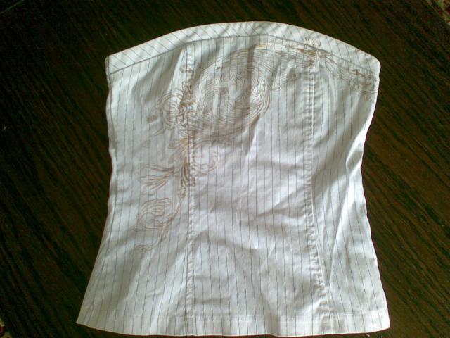 Labai graži liemenuota palaidinukė, elastinga, šone užtrauktukas. Priekyje aukso spalvos ornamentas, labai gražiai žiūrisi. Tinka nešioti nuogais pečiais arba, kaip dabar madinga, ant marškinukų su rankovėmis. Na, čia jau kaip prisiderinsit ;)