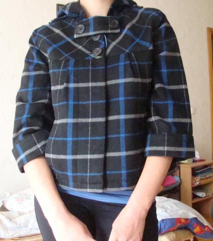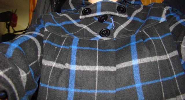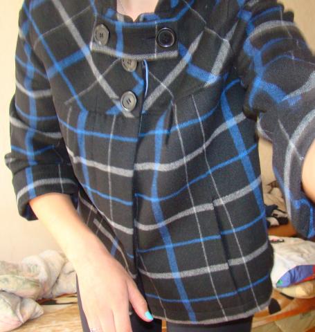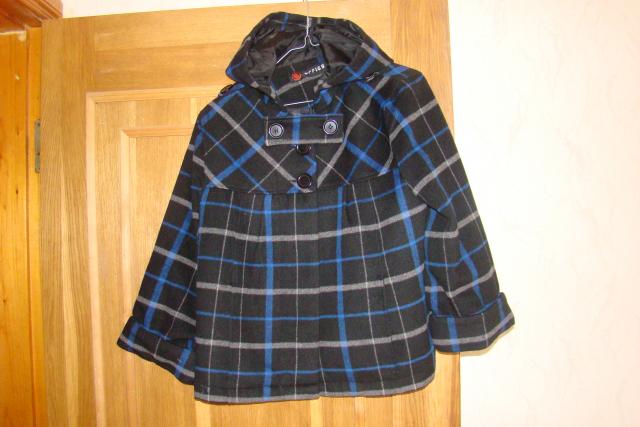 Juodas paltukas su mėlynais ir pilkais dryžiais.Labai patogus,tinka nešioti rudenį ir pavasarį.Be defektų.Už naują mokėjau 99lt.Su kapišonu.