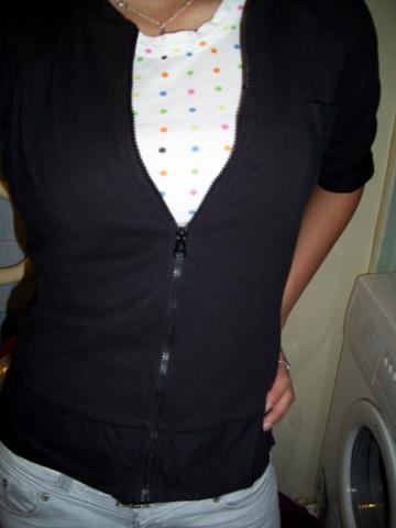 Paprastutis. 3/4 rankovėmis kurios dar užsilenkia kaip marškinukų rankovės,yra kišenytė :)