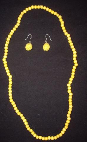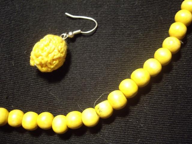 Geltonos spalvos, mediniai karoliukai ir nerti auskarai, iš Ibero parduotuvės.