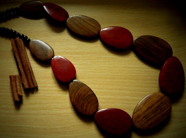 Papuošalas ant kaklo iš medžio ir plastmasės.