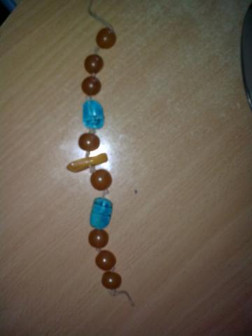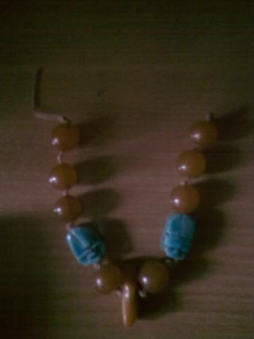 Va tokia konstrukcija ant lininio siūlo iš lydyto ir nelydyto gintaro bei keraminių skarabėjų ;), visas ilgis - apie 18 cm.