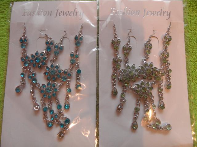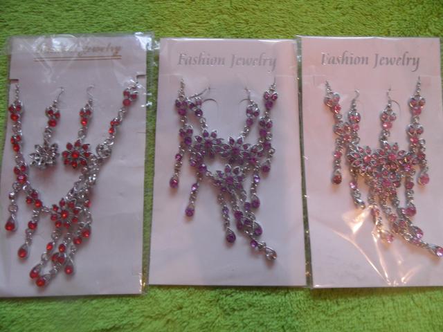 Bižuterija. Nauji. Auskarų ir kolje komplektai. Su kristalais. Komplektų "Gėlės" spalvos: - rožinė - violetinė - žalsva - raudona - žydra