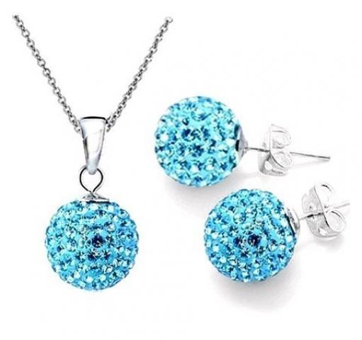 Dailus, auskariukų ir pakabuko komplektukas, su skaidriais melsvos spalvos kristaliukais. Naujas. Komplekte yra dar melsva dežutė.