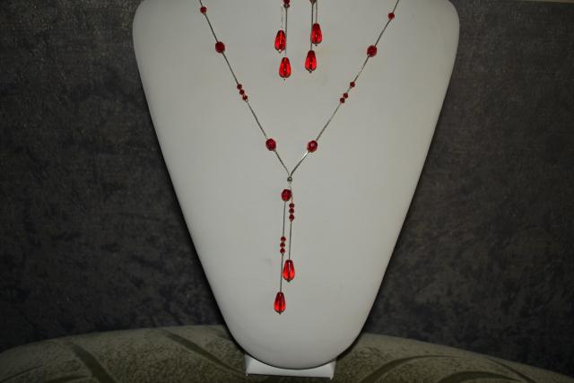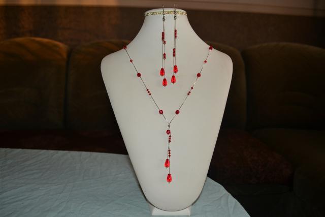 Vėrinys ir auskarai iš raudono stiklo ir swarovski kristalų