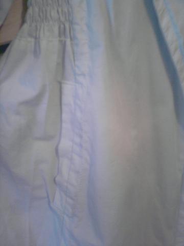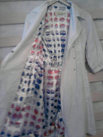 Beveik naujas baltos spalvos paltas su spalvotu pamušalu, yra kišenės, rašo dydį XL, bet yra universalus, tinka nuo S iki XL dydžiui.