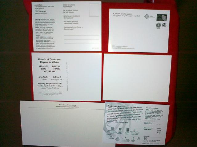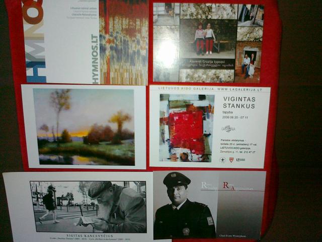 Šeši parodų atvirukai. Rodomi iš abiejų pusių ir aprašymai stambiu planu. Instaliacija "Tautiška giesmė". Varieties of Landscape:Virginia in Vilnius. ALAVERDI Gruzija šypsosi (foto M.Abromavičius Neboisia). V.Stankus. Tapyba(2006m.).S.Kancevyčius.Iš ciklo "Paryžius. Žmonės". Romų atgimimas. Vieno atviruko kaina 0.50 eur. Galima rinktis.