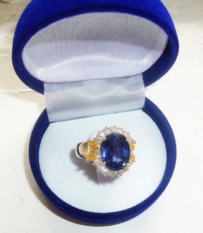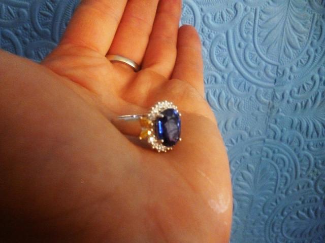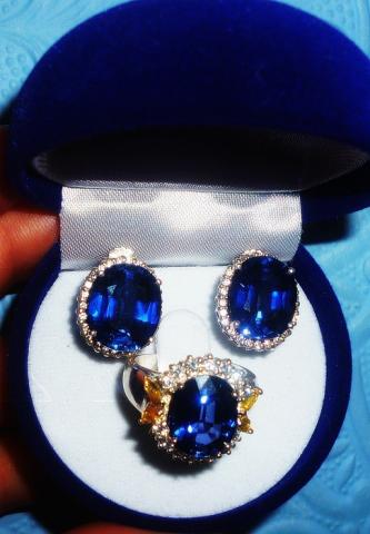 labai grazus sidabrinis rinkinys kuri sudaro didelis ziedas su melynu sapfyru bei geltonais citrino akmenimis ir auskarais kuriuos sudaro melyni sapfyrai bei balti topazai.galima pirkti atskirai.ziedas 250 lt.auskarai 220 lt.antras ziedas foto taip pat yra pardavime.tai 585 pr,baltas auksas su deimantais.1100lt